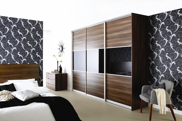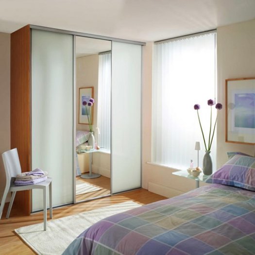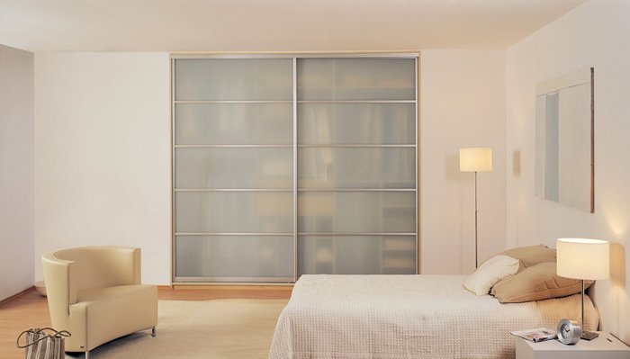 Также вместо того, чтобы купить шкаф в спальню, можно просто оградить одну из стен раздвижной системой дверей и спроектировать необходимое внутренне наполнение: это могут быть любые полки, вешалки, ящики и отсеки что и в стандартном шкафу. Самым надежным материалом для металлического профиля такого механизма служит анодированный алюминий, а вся конструкция представляет собой своеобразную гардеробную.