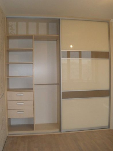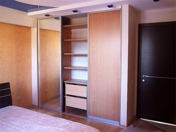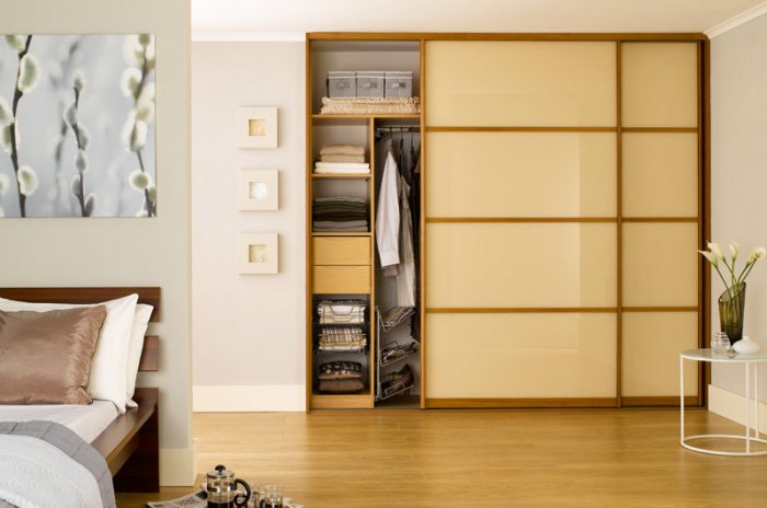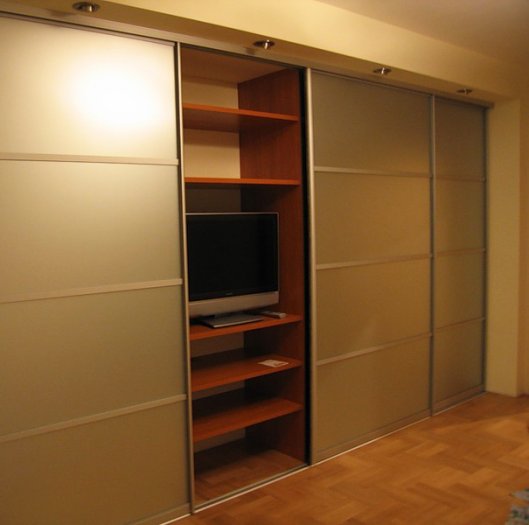 Конструктивно встроенные шкафы представляют собой систему раздвижных дверей, которыми перекрывают определенный участок комнаты, заполняя его всевозможными полками, отсеками, перегородками, ящиками, корзинами, штангами для вешалок и прочими элементами внутреннего наполнения.